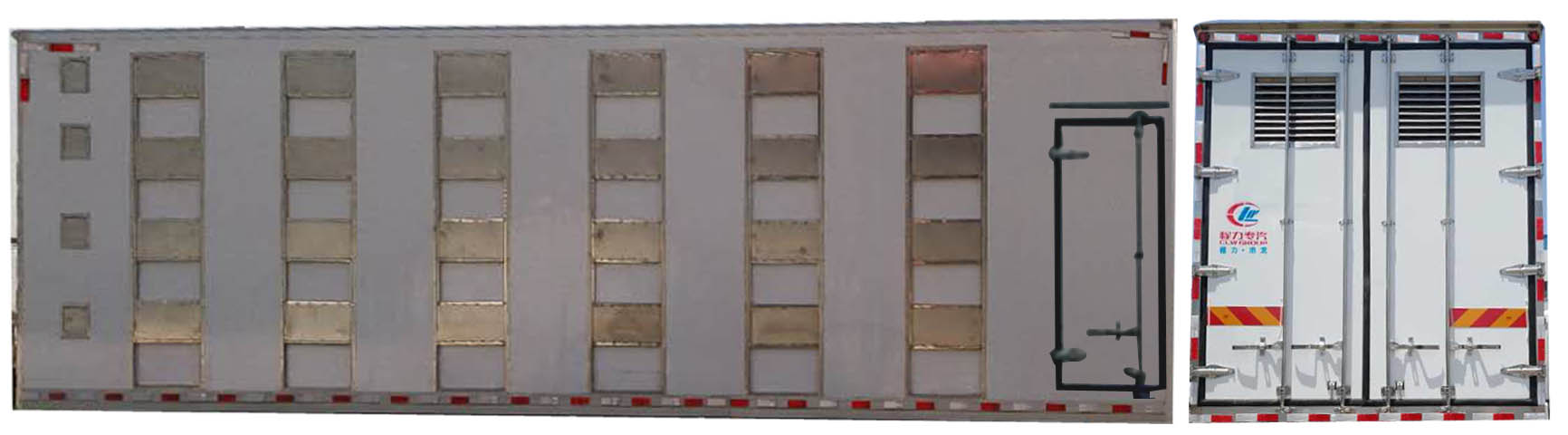 | 其他 | 該車用于運(yùn)輸雛禽;其中貨箱前部?jī)?nèi)長(zhǎng)(mm):800,860,900;用于安裝制冷機(jī)與水箱,貨箱實(shí)際內(nèi)長(zhǎng)(mm):8660,8430,8330;整車長(zhǎng)/前懸/軸距/后懸尺寸對(duì)應(yīng)關(guān)系(mm):12000/1555/1800+4700+1350/2595;12000/1530/2000+4500+1350/2620,12000/1555/1800+4725+1300/2620,12000/1555/2000+4525+1300/2620;頂部封閉不可開(kāi)啟,隨底盤選裝駕駛室;防護(hù)材料:Q23碳鋼,連接方式:左右側(cè)面及后下部防護(hù)均采用焊接連接,后下部防護(hù)斷面尺寸(mm):140×50,后下部防護(hù)離地高度(mm):500;安裝帶有衛(wèi)星定位功能的行駛記錄儀;僅選用ISGe5-400,SC9DF340Q5,ISGe5-320型號(hào)發(fā)動(dòng)機(jī),對(duì)應(yīng)油耗值(L/100km)分別為40.81,40.73,42.72;ABS系統(tǒng)控制器型號(hào):3550X-1010,ABS生產(chǎn)企業(yè):東風(fēng)電子科技股份有限公司,擴(kuò)展箱體四層窗以及后部雙開(kāi)門。 | ||