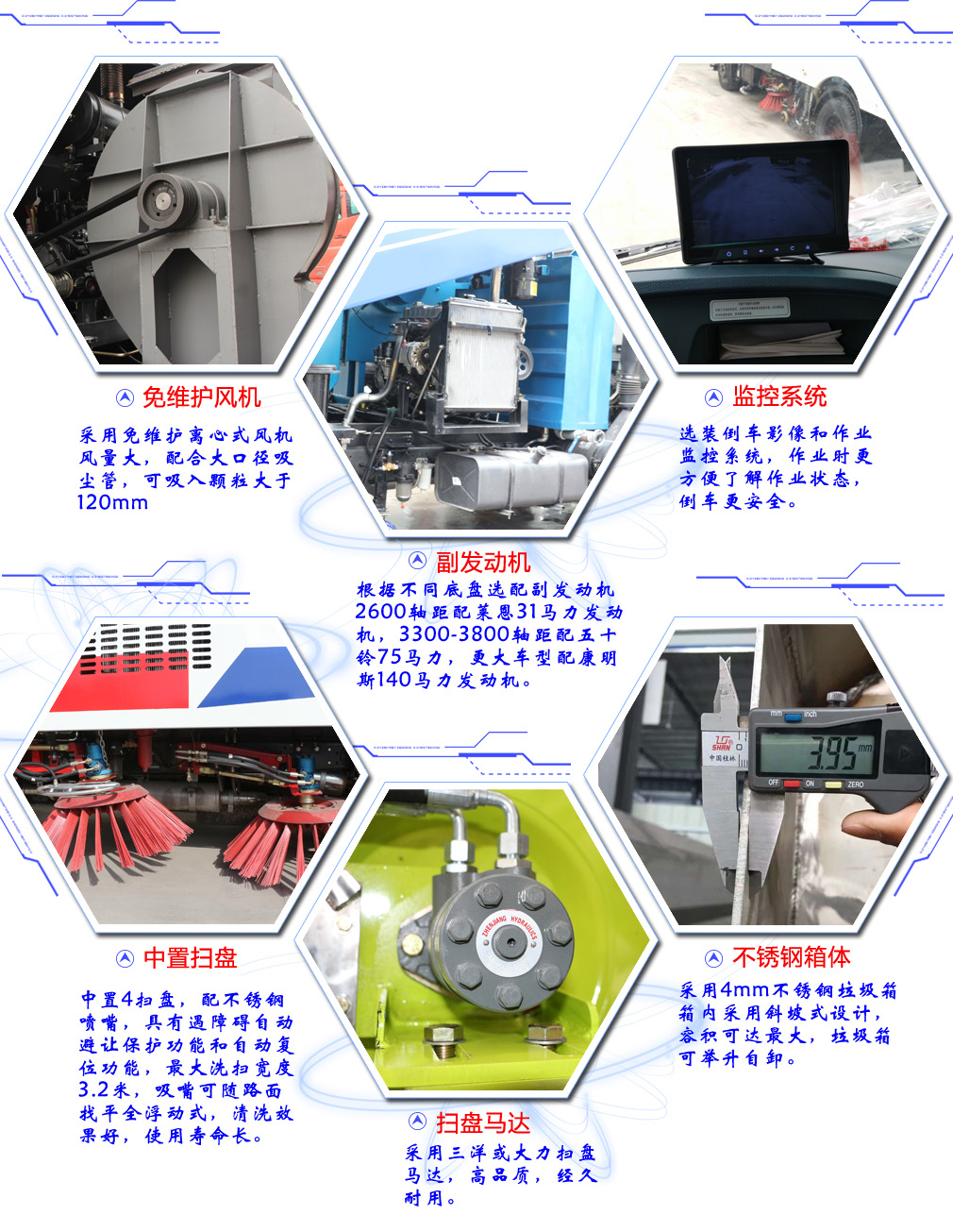| 配置說(shuō)明 | 1、掃路車采用中置4掃盤加后置吸盤作業(yè)方式,掃盤轉(zhuǎn)速可實(shí)現(xiàn)獨(dú)立3檔調(diào)速;副發(fā)動(dòng)機(jī)采用江鈴78馬力副機(jī);掃盤馬達(dá)為大力品牌馬達(dá);電控希望采用施耐德控件開關(guān);臺(tái)灣液壓閥;皖液液壓油泵;新西山水泵;免維護(hù)自分離式離合器;免維護(hù)風(fēng)機(jī);不銹鋼水箱;不銹鋼垃圾箱;尾部LED箭頭燈;手動(dòng)泵應(yīng)急系統(tǒng);前掃刷臂轉(zhuǎn)動(dòng)機(jī)構(gòu)使用高新耐磨工程隔套,免打黃油;精密冷彎無(wú)縫液壓油管。 2、選裝配置:倒車和右掃作業(yè)監(jiān)控系統(tǒng);前沖后灑;前置綠化炮裝置;前后噴霧裝置;自潔帶自動(dòng)卷繞盤;按需求加大副水箱;手持吸塵管;低水位報(bào) 系統(tǒng);前置推雪鏟或除雪滾刷裝置。 | |