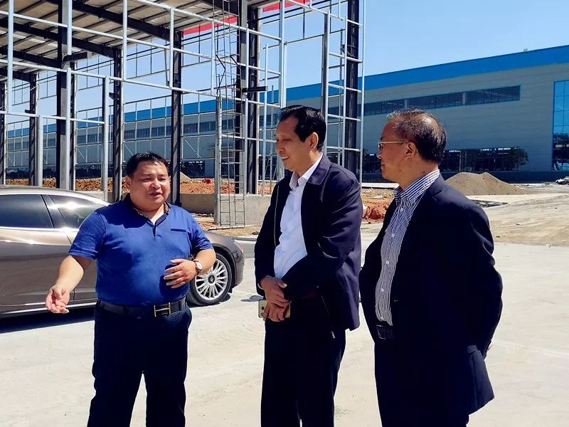 省**統(tǒng) 部副部長、黨組書王兆民(中),省工商聯(lián)副羅紹友(右),在程力汽車工業(yè)園商用車生產(chǎn)基地二期工程施工現(xiàn)場,認(rèn)真聽取省工商聯(lián)副會長、程力汽車集團(tuán)股份有限公司總經(jīng)理程阿羅(左)匯報施工建設(shè)情況。
