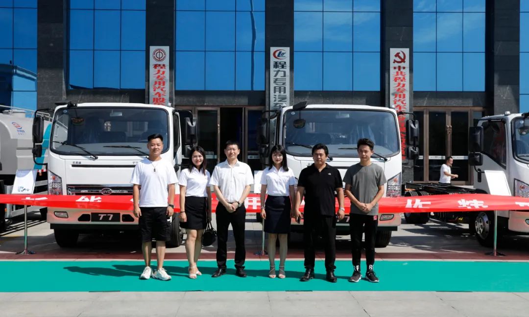 程力新能源專用車展示推廣會(huì)上,新能源裝備專業(yè)廠劉輝總經(jīng)理與程力集團(tuán)簽約網(wǎng)紅合影紀(jì)念。