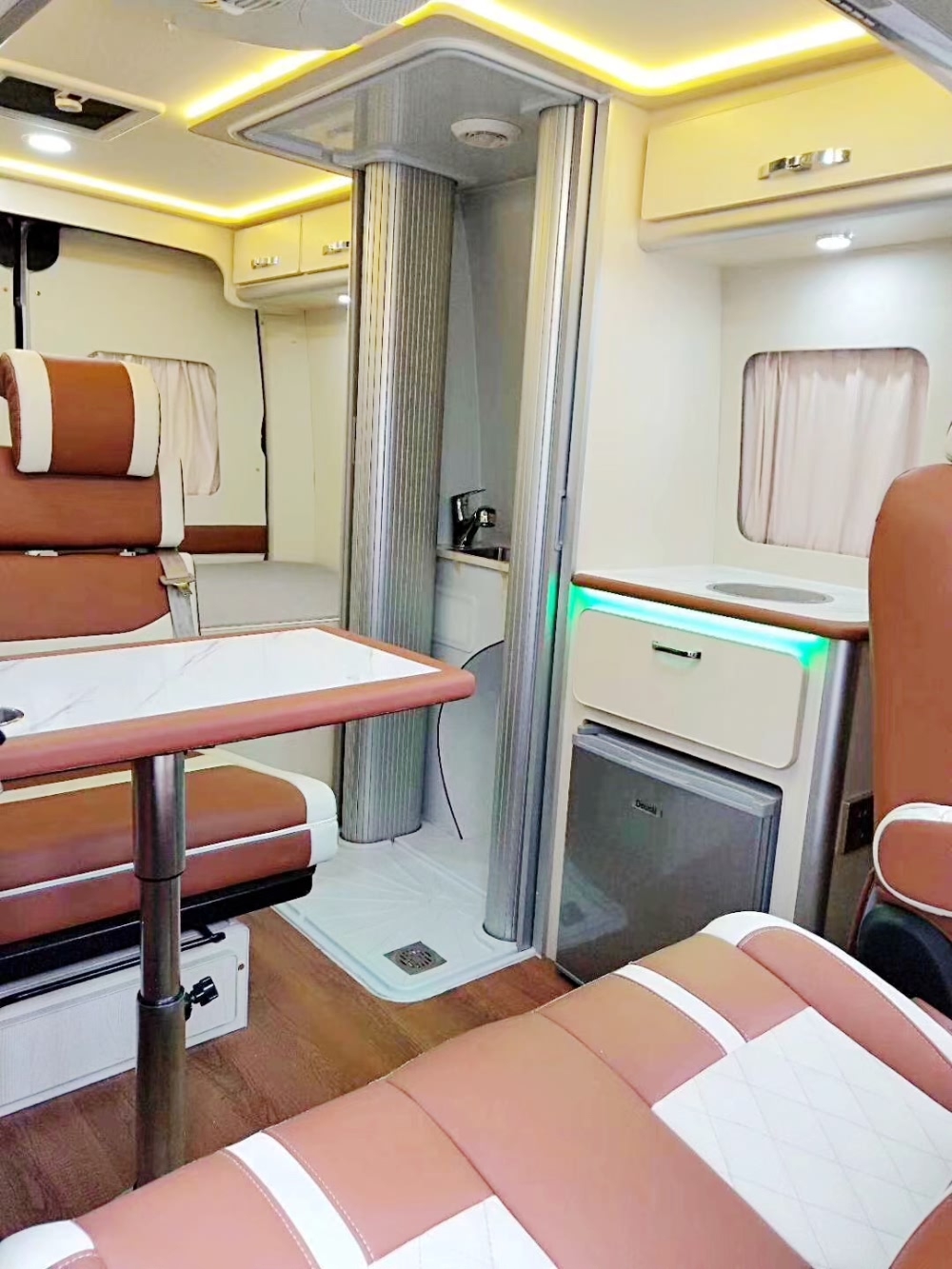 上汽大通V80短軸中頂B型房車(chē)內(nèi)部軟包裹設(shè)計(jì),淺色系的家具與皮質(zhì)包裹的座椅讓房車(chē)的商務(wù)風(fēng)更加濃厚。車(chē)廂從前到后的布局依次是會(huì)客區(qū)、廚房、衛(wèi)生間和橫床,此款上汽大通V80短軸中頂B型房車(chē)設(shè)施配置齊全、基礎(chǔ)生活功能設(shè)計(jì)完善。會(huì)客區(qū)的多功能餐桌可拆卸,副駕駛的皮質(zhì)座椅可向后翻轉(zhuǎn)圍坐,也可與后排座椅組成臨時(shí)休息的拼床。