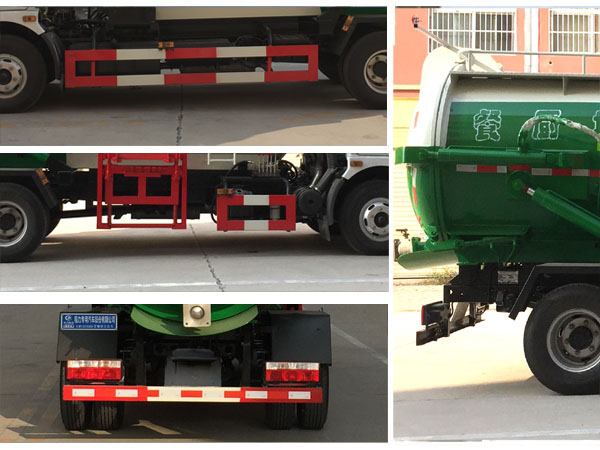 | 其他 | 僅選用3800軸距底盤改裝。側(cè)防護材料:Q23碳鋼,連接方式:左右側(cè)面及后下部防護均采用焊接連接,后下部防護斷面尺寸(mm):120×50,后下部防護離地高度(mm):445.ABS型號為ABS/ASR-24V-4S/4M,生產(chǎn)廠家為襄陽東風(fēng)隆誠機械有限責(zé)任公司.車輛裝有側(cè)裝垃圾桶升降裝置,封閉式垃圾罐等裝置,用于餐廚垃圾收集,轉(zhuǎn)運及卸料作業(yè)。 | ||