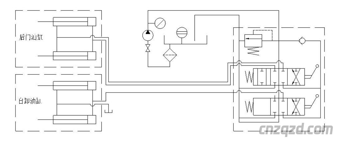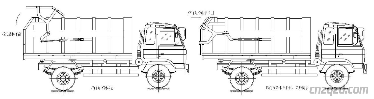 垃圾對接車是由汽車底盤、自卸油缸、后門油缸、附車架、垃圾箱體及后門擺桿等組成。該 車操作由液壓控制系統(tǒng)來完成,控制方式可以為手動或電氣控。