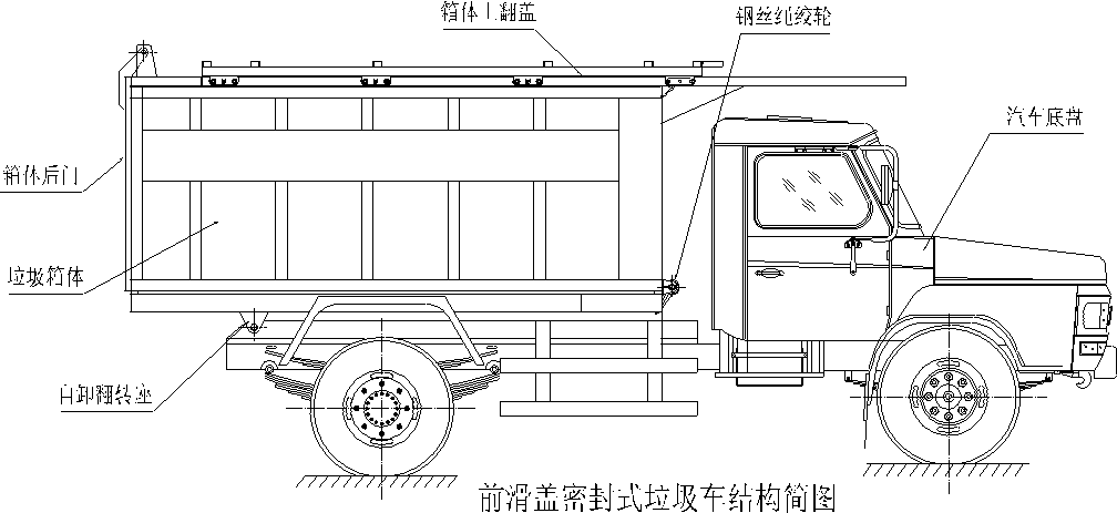 該車是由汽車底盤、自卸油缸、上滑蓋、附車架、垃圾箱體等組成。該車操作由液壓控制系統(tǒng)和手動絞輪控制來完成,控制方式可以為手動或電氣控。