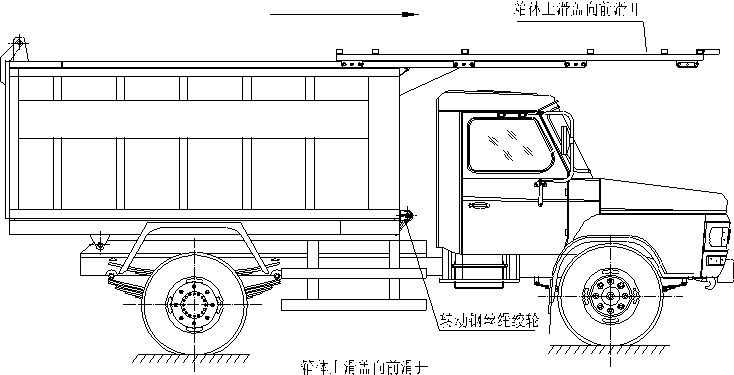 該車主要用于城鎮(zhèn)垃圾的垃圾收集、轉(zhuǎn)運和卸料。操作開蓋控制絞輪打開垃圾車上蓋向上向前滑動開啟,對垃圾進行收集,這時垃圾車箱體后門處于關(guān)閉狀態(tài),完成垃圾裝載后操作控制絞輪關(guān)閉垃圾車上蓋,這時箱體密封,垃圾堆放在箱體內(nèi);進行傾卸時,操作自卸控制閥,垃圾箱繞后翻轉(zhuǎn)軸傾斜體舉,箱體后門打開,垃圾傾卸出箱體;起該車由手動控制來完成該車的上滑蓋的開啟和關(guān)閉及由液壓控制系統(tǒng)來執(zhí)行整車自卸功能,結(jié)構(gòu)簡單,操作方便。該垃圾車的收運方式是目前國內(nèi)廣泛采用的垃圾收集轉(zhuǎn)運方式,其專用裝置的功能均以汽車發(fā)動機為動力,通過液壓機構(gòu)手動或電控、氣控來實現(xiàn)。車輛的箱體采用優(yōu)質(zhì)炭鋼板全密封焊接結(jié)構(gòu),具有強度高、重量輕,防塵、防溢不產(chǎn)生二次污染等優(yōu)點。