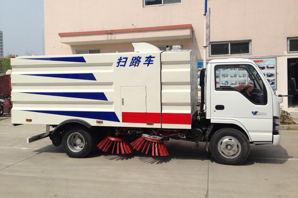 清掃系統(tǒng):副發(fā)動機驅動液壓油泵和風機工作。液壓油泵驅動左、右掃盤伸縮、舉升、旋轉。左右掃盤將兩側的垃圾掃**洗掃車下,吸嘴前方。風機使垃圾箱、吸管和吸嘴組成的風道產生高速氣流,在氣流的作用下,垃圾吸入吸嘴,并進入垃圾箱中。底盤發(fā)動機驅動洗掃車向前行走,掃**吸嘴前方的垃圾不斷進入到吸嘴中,并源源不斷地被吸到垃圾箱中,實現(xiàn)路面清掃。