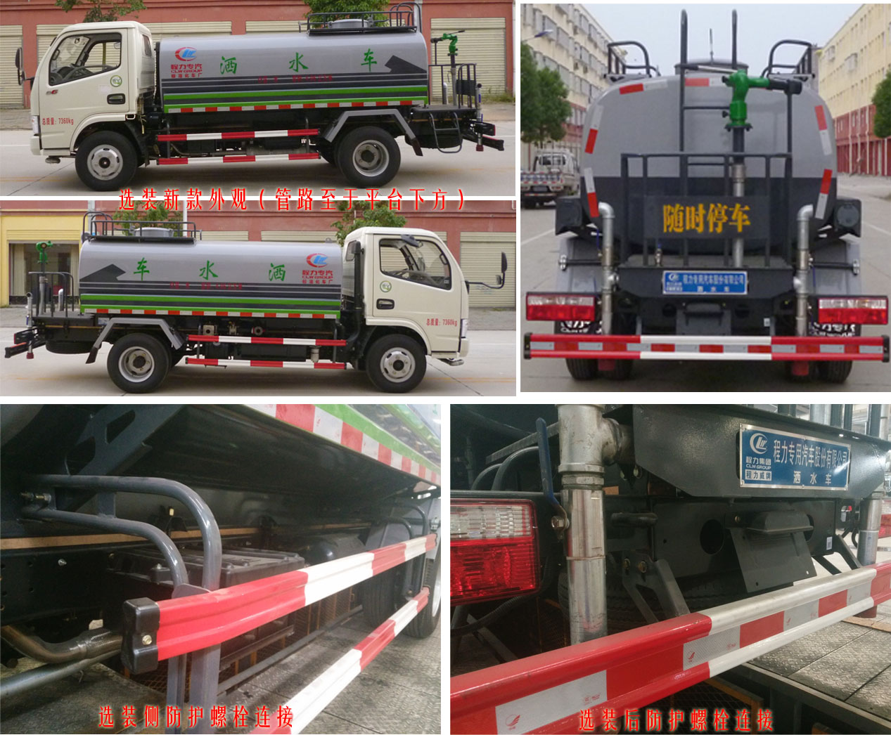 | 其他 | 1、隨底盤選裝駕駛室前面罩以及前霧燈。2、罐體有效容積:4.06立方米,罐體外形尺寸(長×長軸×短軸關(guān)系為(mm): 3400×1600×1100,僅選用3308軸距。3、側(cè)防護及后下部防護裝置均采用Q23材質(zhì),均采用焊接連接,后下部防護尺寸:50×120(mm),離地面高度470mm。4、可選裝新款外觀及管路**于平臺下方。5、可選裝側(cè)防護及后下部防護裝置采用Q235B碳鋼,采用螺栓連接,后下部防護尺寸:50×120(mm),離地面高度450mm。6、文字噴圖位置、車輛顏色及局部細節(jié)可變化。7、ABS廠家及型號:襄陽東風隆誠機械有限責任公司/ABS/ASR-24V-4S/4M;8、選裝前沖專用裝置位于駕駛室和罐體之間。9、專用裝置:罐體,主要用于灑水及園林綠化。 | ||