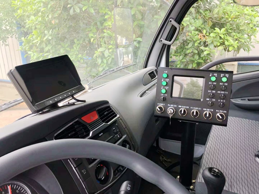 9、該車采用駕駛室智能控制模式,環(huán)衛(wèi)工人在駕駛室內(nèi)即可完成車輛的所有操作,并在右掃盤處和尾部配有高清攝像頭,工作時可即時掌控車輛的工作狀態(tài),即時調(diào)整。