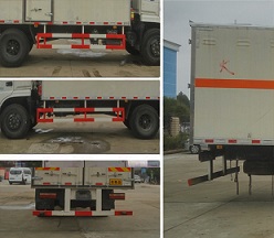 | 其他 | 該車適用于運(yùn)輸危險(xiǎn)品。廂體頂部封閉,不可開啟。運(yùn)送危險(xiǎn)品的品名:專用煙火制品,煙花爆竹,運(yùn)送爆炸品的項(xiàng)號(hào):1.1G,1.2G,1.3G,1.4G,1.4。當(dāng)前懸為1440mm時(shí):整車長/軸距/后懸對(duì)應(yīng)關(guān)系為(mm)8580/5600/1540、8580/5100/2040、8580/4700/2440、8580/4500/2640。當(dāng)前懸為1250mm時(shí):整車長/軸距/后懸對(duì)應(yīng)關(guān)系為(mm)8580/5600/1730、8580/5100/2230、8580/4700/2630、8580/4500/2830。側(cè)防護(hù)、后防護(hù)與車輛均采用焊接連接,材料均為:Q23,后防護(hù)斷面尺寸(mm):120×50, 離地高度:450 mm。發(fā)動(dòng)機(jī)ISB190 50,ISB170 50,ISB210 50,ISD180 50,YC6JA180-50,EQH180-52,ISD190 50,YC4E160-56,YC4S150-50,ISB170-50分別對(duì)應(yīng)的油耗值為:26.5,26.5,26.5,26.8,27.1,26.2,26,25.8,25.7,26.5。僅采用底盤子午線輪胎和帶ABS的底盤,該車前輪安裝盤式制動(dòng)器,排氣管前置,裝配限速裝置,限速80km/h,安裝帶有衛(wèi)星定位功能的行駛記錄儀。ABS型號(hào)為ABS-E 4S/4M,生產(chǎn)企業(yè)是威伯科汽車控制系統(tǒng)(中國)有限公司。隨底盤選裝駕駛室。選裝側(cè)門型式及位置,選裝后部液壓尾板。后部液壓尾板收起狀態(tài)長度是250mm。 | ||